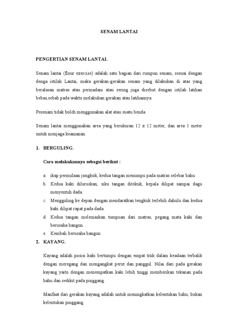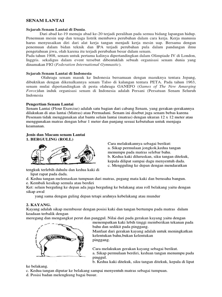 BAB II LANDASAN TEORI 21 Pengertian Senam Lantai Senam lantai floor exercise adalah satu bagian dari rumpun senam sesuai dengandengan istilah Lantaimaka gerakan-gerakan senam yang dilakukan di atas yang beralasanmatras atau permadani atau sering juga disebut dengan istilah latihan bebassebab padawaktu melakukan gerakan atau latihannya. Pesenam tidak boleh menggunakan.