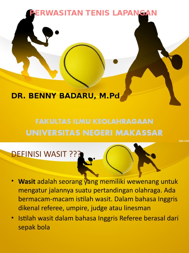 Istilah-Istilah penting dalam Permainan Tenis Ace Servis yang dilakukan pemain dimana bola masuk dan tidak dapat dijangkau oleh pemain lawan. Dalam bahasa Inggris dikenal referee umpire judge atau linesman. Jeu de paume mulai disebut dengan tennis ketika raket digunakan 2 PERWASITAN TENIS LAPANGAN.